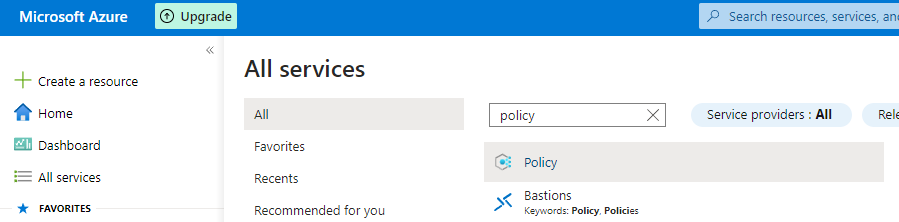 여러 Policy 중 Allowed locations를 등록하여 Resource Group 에 location 제한을 추가해보도록 하겠습니다. Owner 권한이 있는 계정으로 로그인 합니다. All services > policy 를 검색하여 메뉴를 선택합니다.