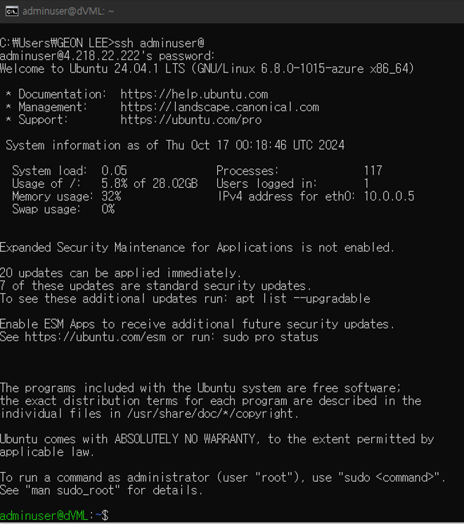SSH 로 Linux VM 접속을 확인합니다. Windows 를 사용중이라면 커멘드 창을 열어(windows 키 + r) cmd를 입력 후 엔터, ssh + 위에서 생성한 계정ID@공인IP 로 접속, password를 입력합니다. 아래와 같이 접속되면 완료!