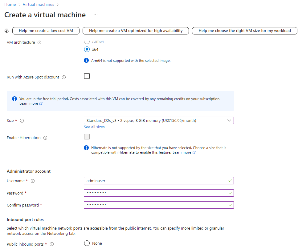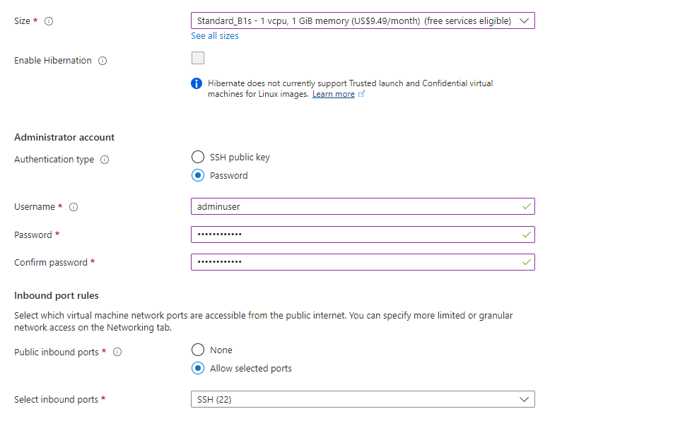 Size 는 Standard_B1s 를 Authentication type은 Password 를 선택하여 id/pw를 입력합니다.