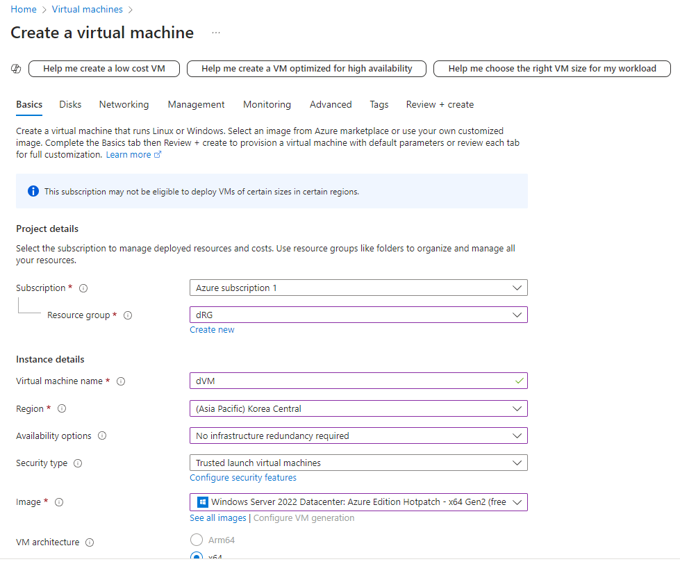 VM의 가용성과 복원력을 높이기 위한 중요한 설정입니다. 이 옵션은 시스템 장애나 유지보수로 인해 VM이 다운되는 것을 방지하고, 서비스의 고가용성(High Availability)을 보장하는 데 도움을 줍니다. Azure는 다양한 가용성 옵션을 제공하여 사용자의 요구 사항에 맞는 수준의 가용성을 설정할 수 있습니다.