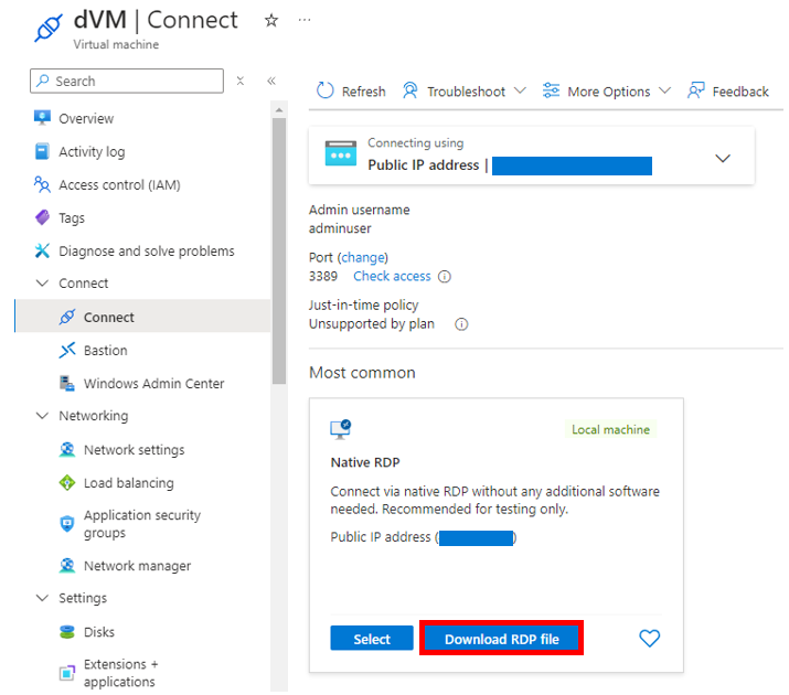 Size와 Administrator account 정보를 입력합니다. 보이지 않고, 따로 명시하지 않은 값은 Default 값 입니다. Next: Disks 를 클릭합니다. Disk 관련 정보는 위의 설명을 참고하세요. 다른 모든 값들은 Default 로 설정한 상태로 수정하지 않고 생성을 합니다. 생성이 완료되면 Go to resource 를 클릭 or Virtual machines > dVM 을 클릭 합니다. Overview 페이지에서 dVM Virtual Machine의 대략적인 정보를 확인할 수 있습니다.