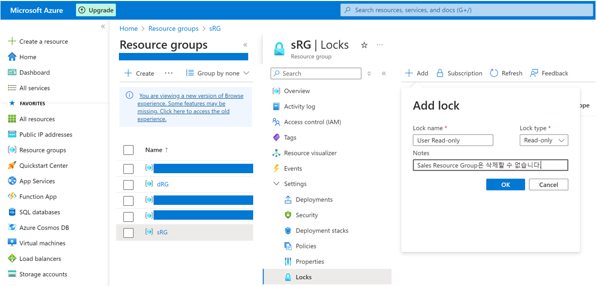 관리자 계정으로 로그인 하여 Resource Groups > sRG > Locks > Add 를 차례대로 클릭합니다. 그리고 아래와 같이 User Read-only lock을 설정하여 sRG Resource Group 의 삭제를 제한합니다.
