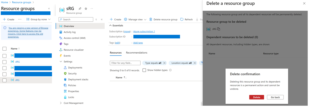 Overview > Delete resource group 을 클릭하여 삭제를 진행합니다.