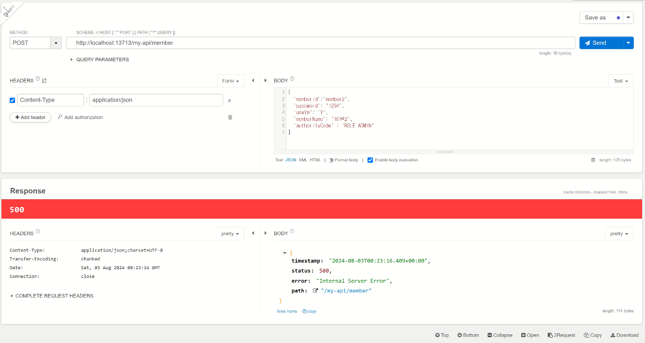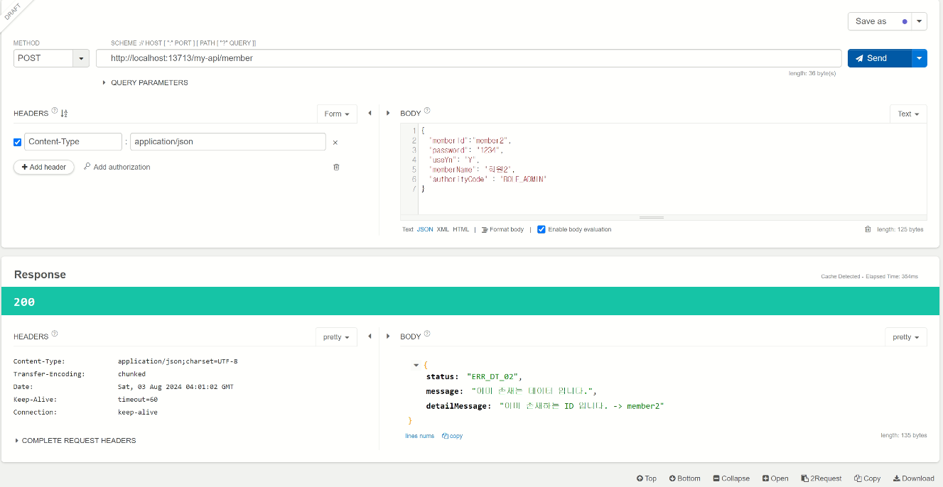 정상 동작 했지만 500 에러가 전달되었네요. ErrorCode 에 EXISTS_DATA