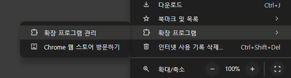 크롬 우측 상단 맞춤설정 및 제어에서 확장프로그램 > 확장 프로그램 관리