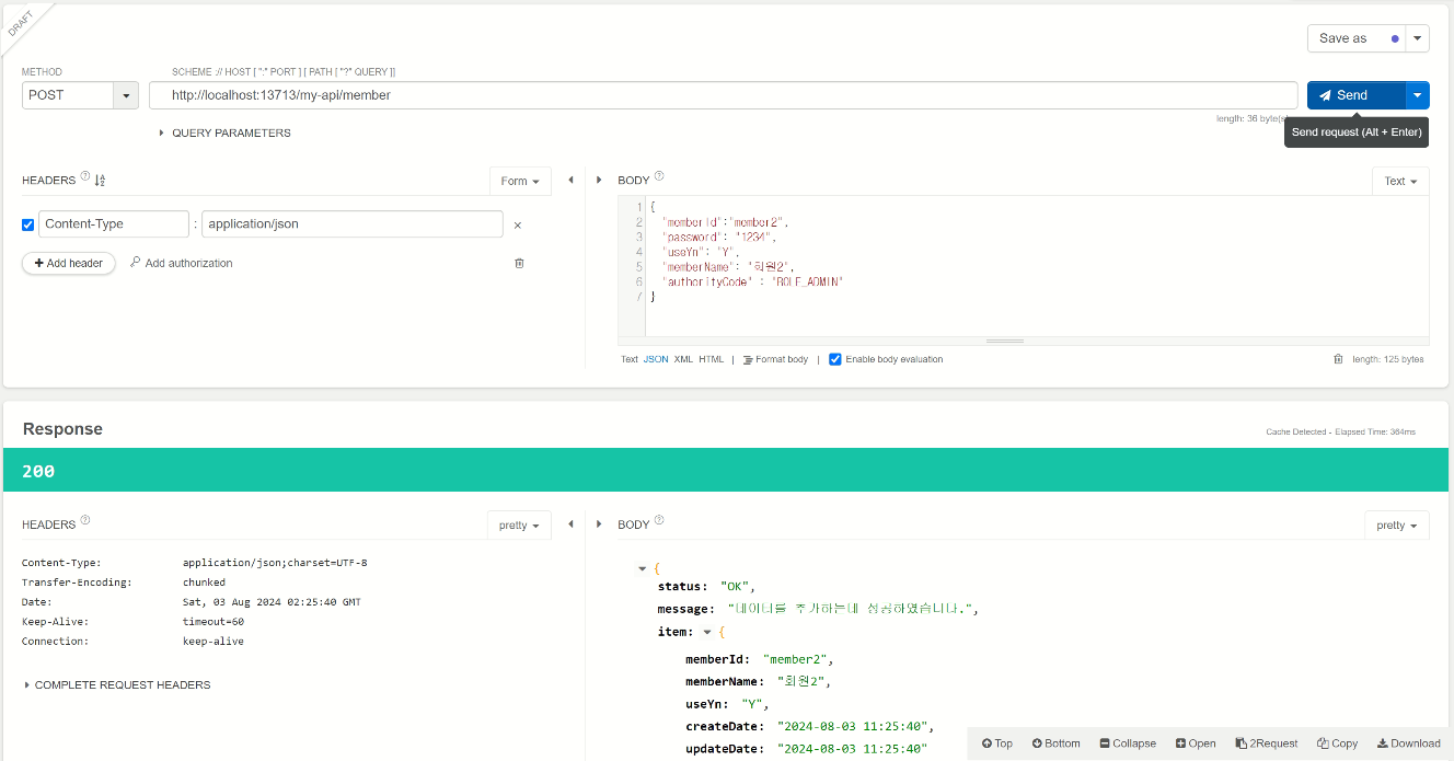 버튼을 클릭하면 (or Alt + Enter) API 로 데이터가 전송되고 응답 결과가 아래 표출 됩니다.