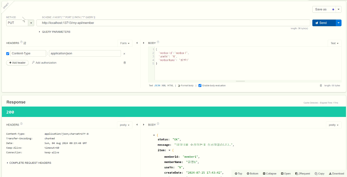 이전 Create API Operation(3) - Create 에서 봤듯이 EntityManager의 merge method 는 select query 로 조회한 데이터와 entity 간의 변경사항이 있을 경우 update query 를 요청합니다. update query 를 발생시키기 위해 useYn 값을 'Y' 로 변경한 후 다시 update 요청을 합니다. useYn 값은 정상적으로 변경되지만 updateDate (Auditing이 적용된 필드) 는 변경되지 않고 이전의 값이 전달 됩니다. Database를 확인해보면 update_dt 는 정상적으로 반영이 됐습니다.