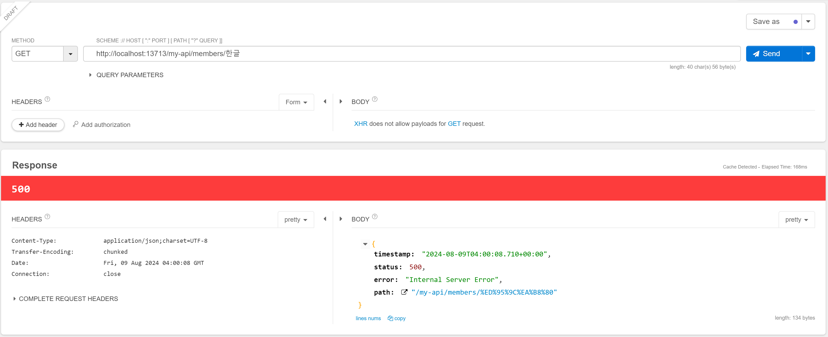 한글 을 전달하니 500 에러 (Internal Server Error)가 발생했습니다. console 을 확인해보니 @Valid 와 다르게 jakarta.validation.ConstraintViolationException 이 발생했습니다.