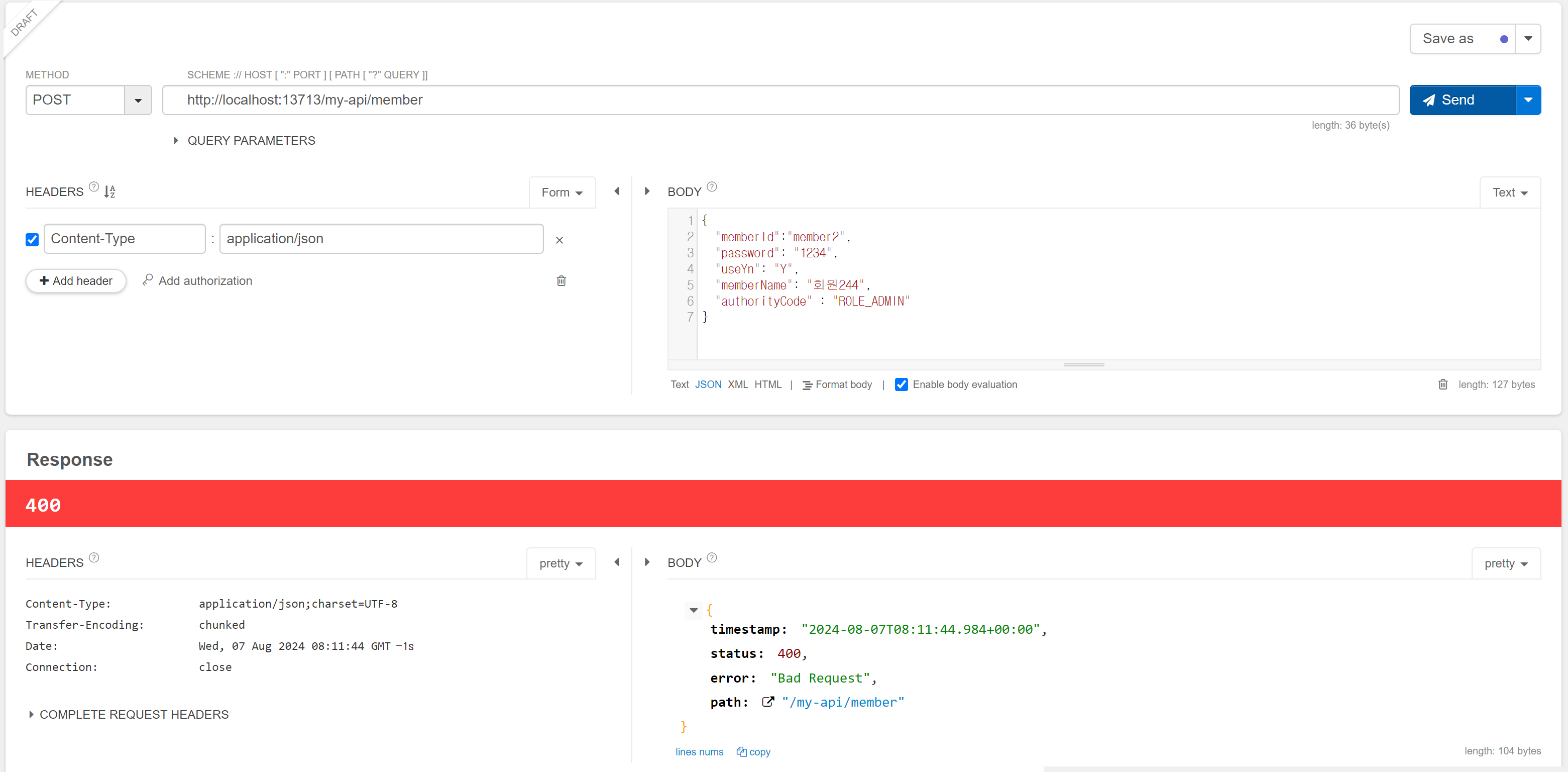 "message": "적합하지 않은 값이 전달되었습니다.",