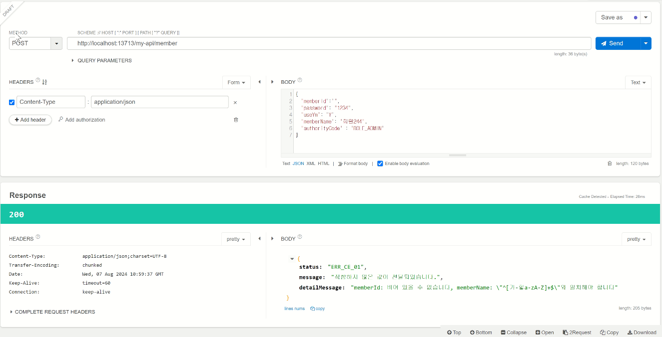, memberName: \"^[가-힣a-zA-Z]+$\"와 일치해야 합니다"