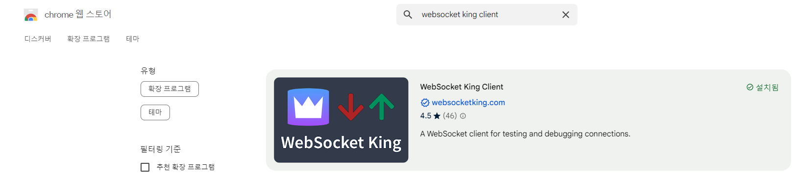 웹소켓 기능을 확인할 수 있는 Chrome의 확장 프로그램을 설치 합니다. Chrome 웹 스토어에서 websocket king client