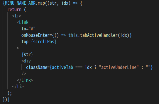 OnMouseEnter 이벤트를 적용하여, 마우스가 올라갈 시, tabActiveHandler(idx) 함수가 실행된다.