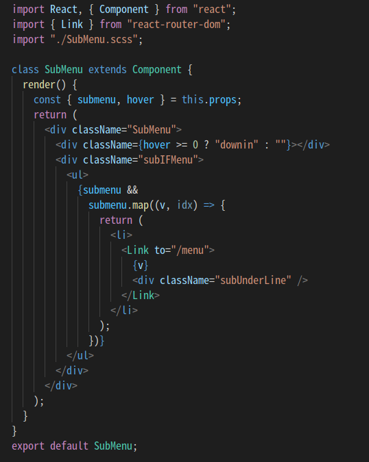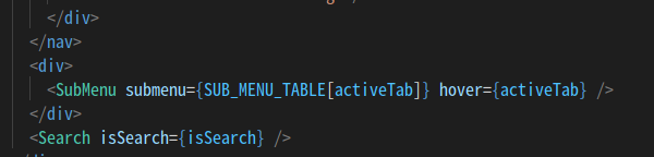 SubMenu 컴포넌트는 해당 데이터만을 받았기 때문에, Index에 맞는 데이터만을 출력하는데 이때, index값과 같거나 크다는 것은, 마우스가 올라갔다는 뜻이기 때문에 Main Menu에 맞는 Sub Menu가 밑으로 출력 되게 된다.