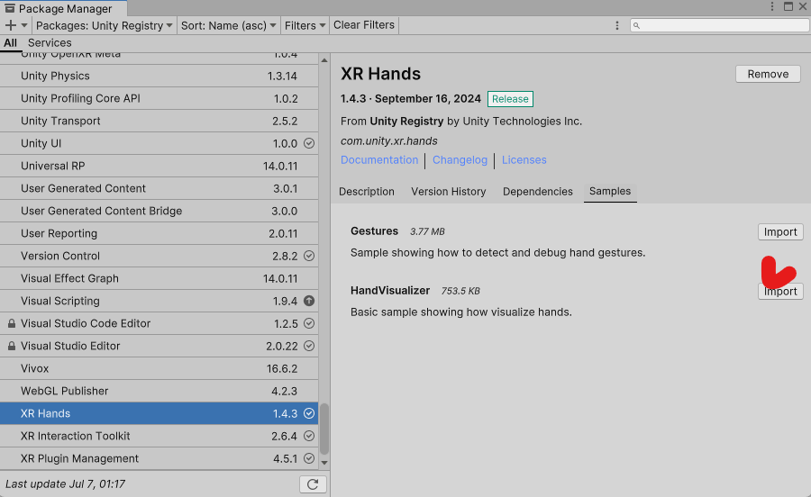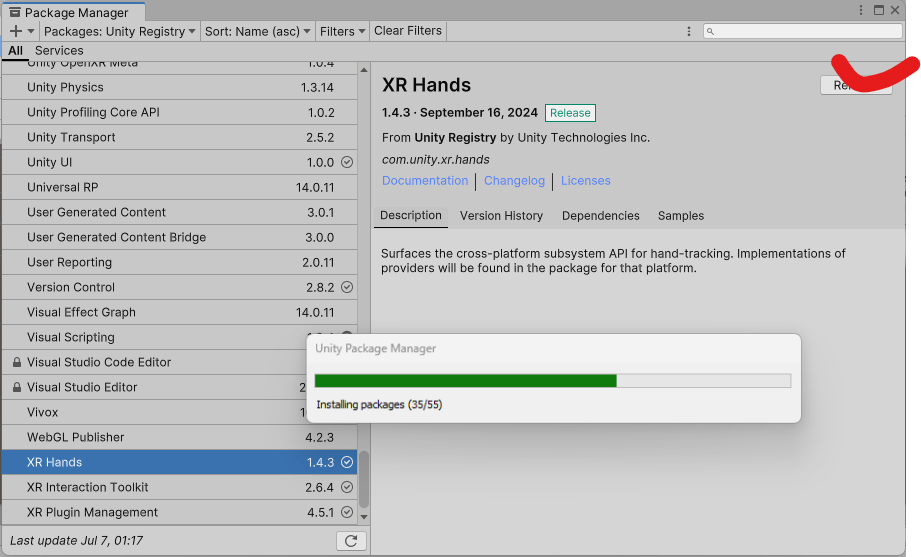 xr과 xrhands를 설치한다.