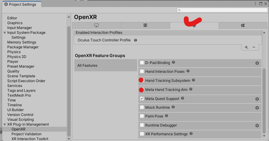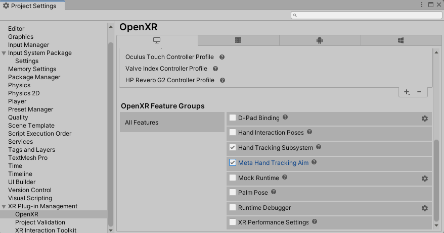 그리고 project setting에 가서 데스크탑, 모바일 환경에서의 HandTracking Subsystem과 Meta hand tracking aim을 설치한다.