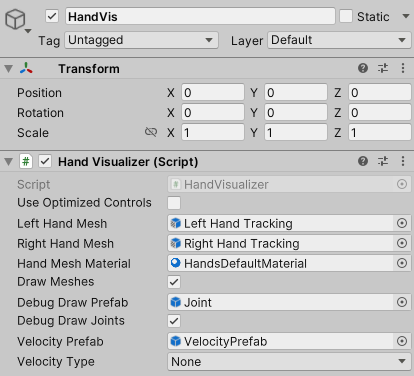 이후 오브젝트에 HandVisualizer 스크립트를 넣고 오브젝트 속성을 채워주면 된다.