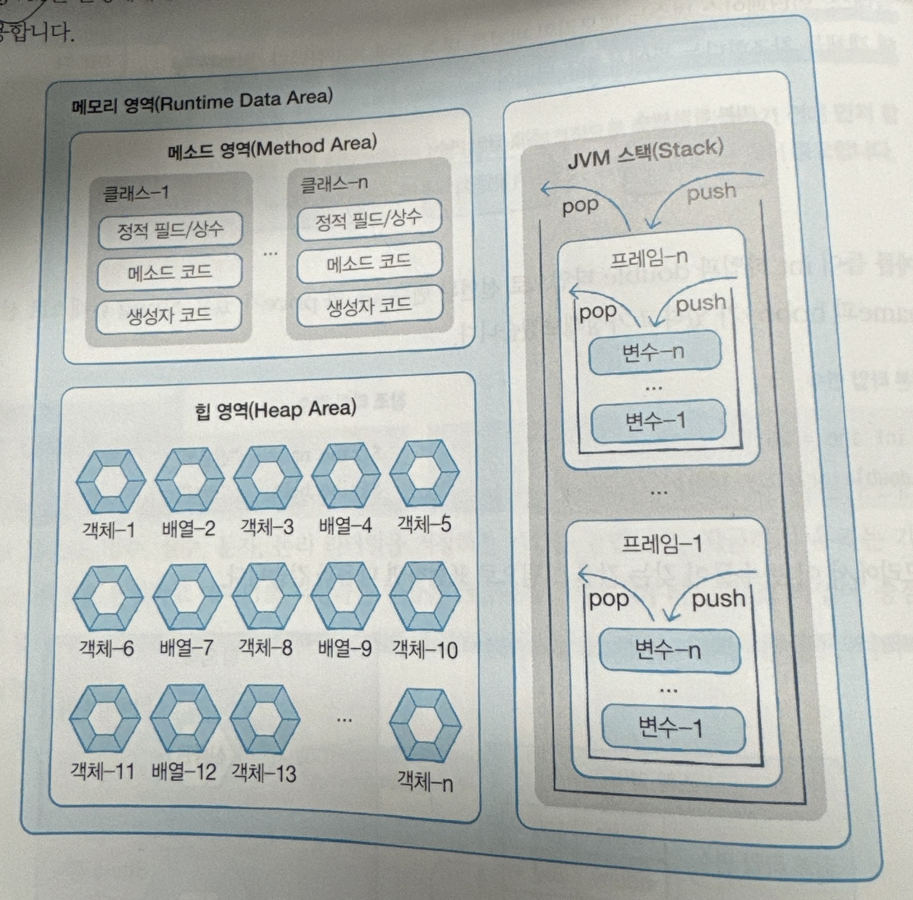 : 코드에서 사용되는 클래스(~.class)들을 클래스 로더로 읽어 클래스별로 정적 필드와 상수, 메서드 코드, 생성자코드 등을 분류해서 저장