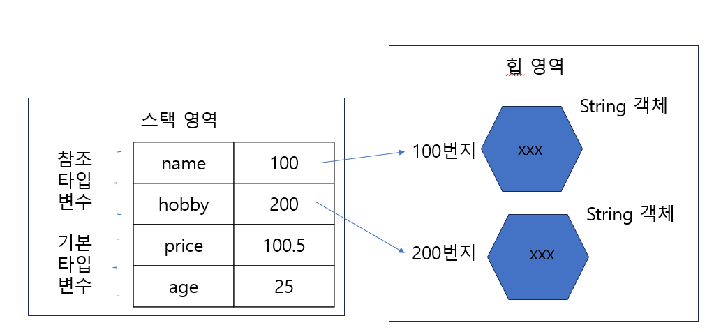 : 기본타입변수는 스택 영역에 직접 값을 가지고 있음