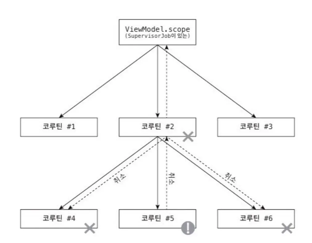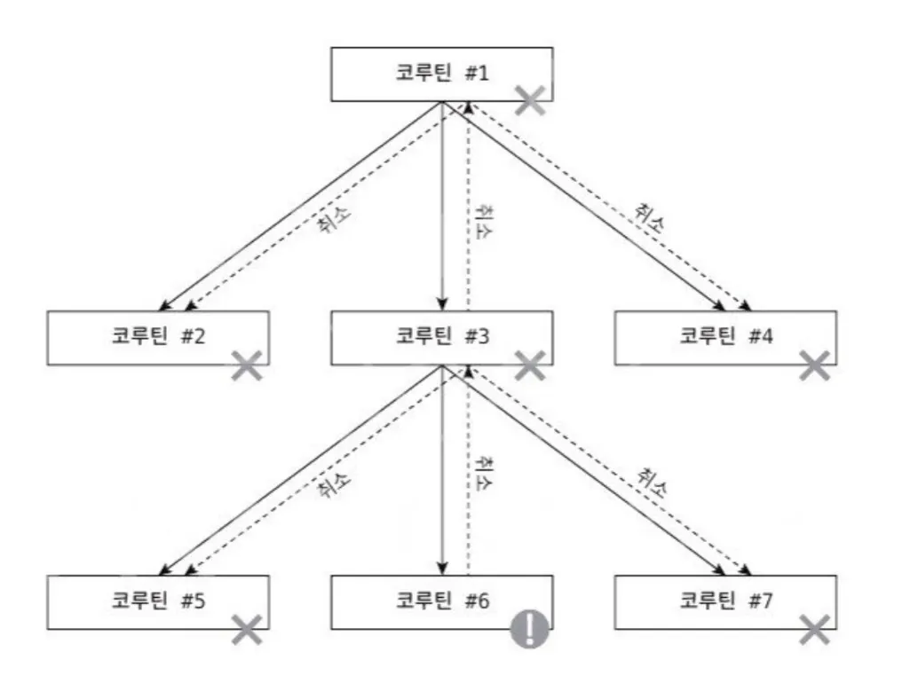 예외는 자식에서 부모로 전파되며, 부모가 취소되면 자식도 취소되기 때문에 쌍방으로 전파됩니다. 예외 전파가 정지되지 않으면 계통 구조상 모든 코루틴이 취소되게 됩니다.