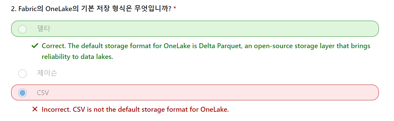 오답해석 : Incorrect. CSV는 OneLake의 기본 저장 형식이 아닙니다.