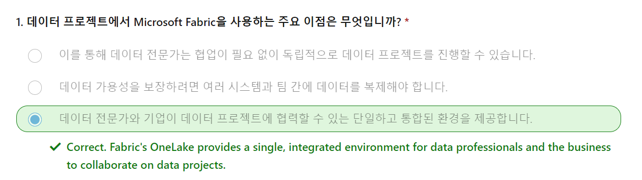 정답해석 : Fabric의 OneLake는 데이터 전문가들과 비즈니스가 데이터 프로젝트에서 협업할 수 있는 단일 통합 환경을 제공합니다.