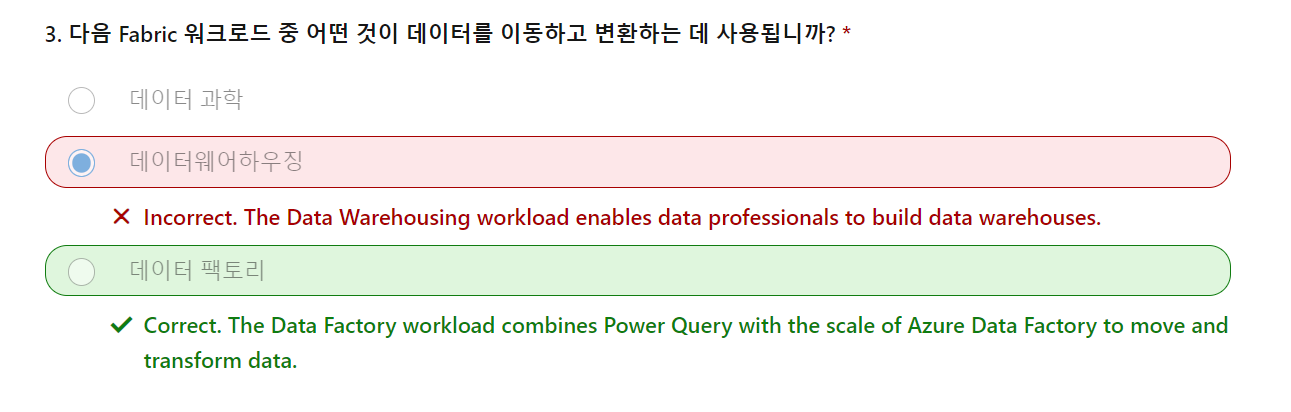 정답해석 : Correct. Data Factory 워크로드는 Power Query와 Azure Data Factory의 확장성을 결합해 데이터를 이동하고 변환할 수 있게 합니다.