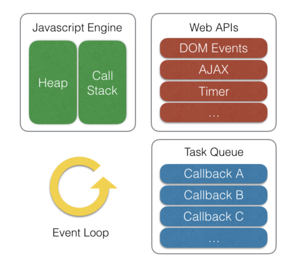 - 비동기 호출을 위해 사용하는 setTimeout, XMLHttpRequest 와 같은 함수들은 Javascript 엔진이 아닌 Web API 영역에 따로 정의되어 있다.