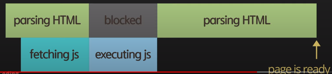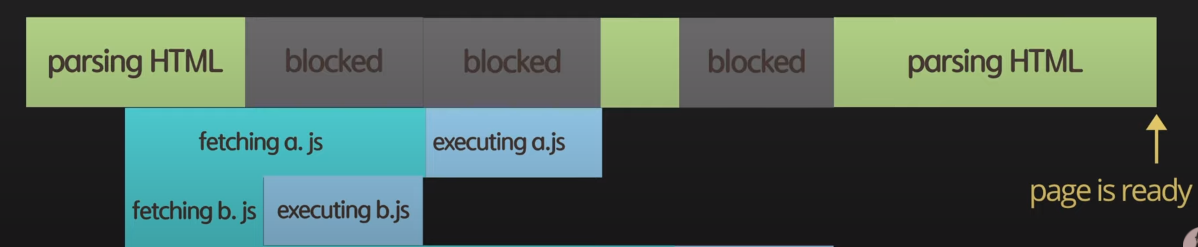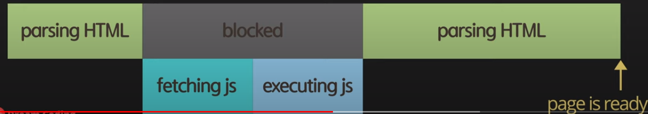 HTML을 파싱하다가 <script>태그를 만나면 HTML파싱을 중단하고 script파일을 다운받고 실행을 끝마친 후에야 다시 HTML파싱을 재개한다.