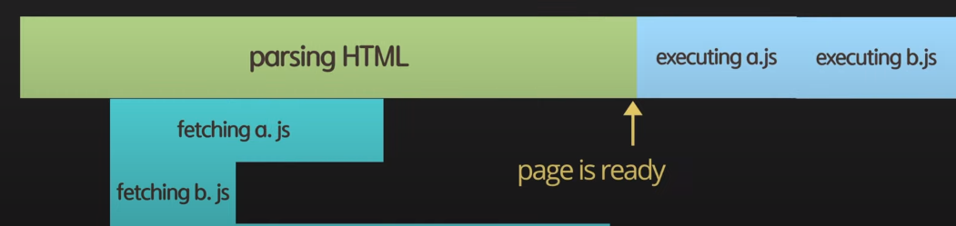 이 방법은 HTML을 파싱하는 동안에 각각의 script파일이 fetching되고 파싱이 끝나면 선언한 순서대로 실행된다.