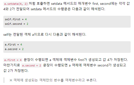 앞에서 만든 pass문장을 삭제하고 그 대신 setdata 함수를 만들었다. 클래스 안에 구현된 함수는 다른 말로 메서드(Method) 라고 한다. 앞으로 클래스 내부의 함수는 항상 메서드라고 표현할 테니 기억해두자.