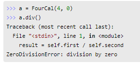 FourCal 클래스의 객체 a에 4,0을 설정하고 div메서드를 호출하면 ZeroDivisionError 오류가 발생한다.