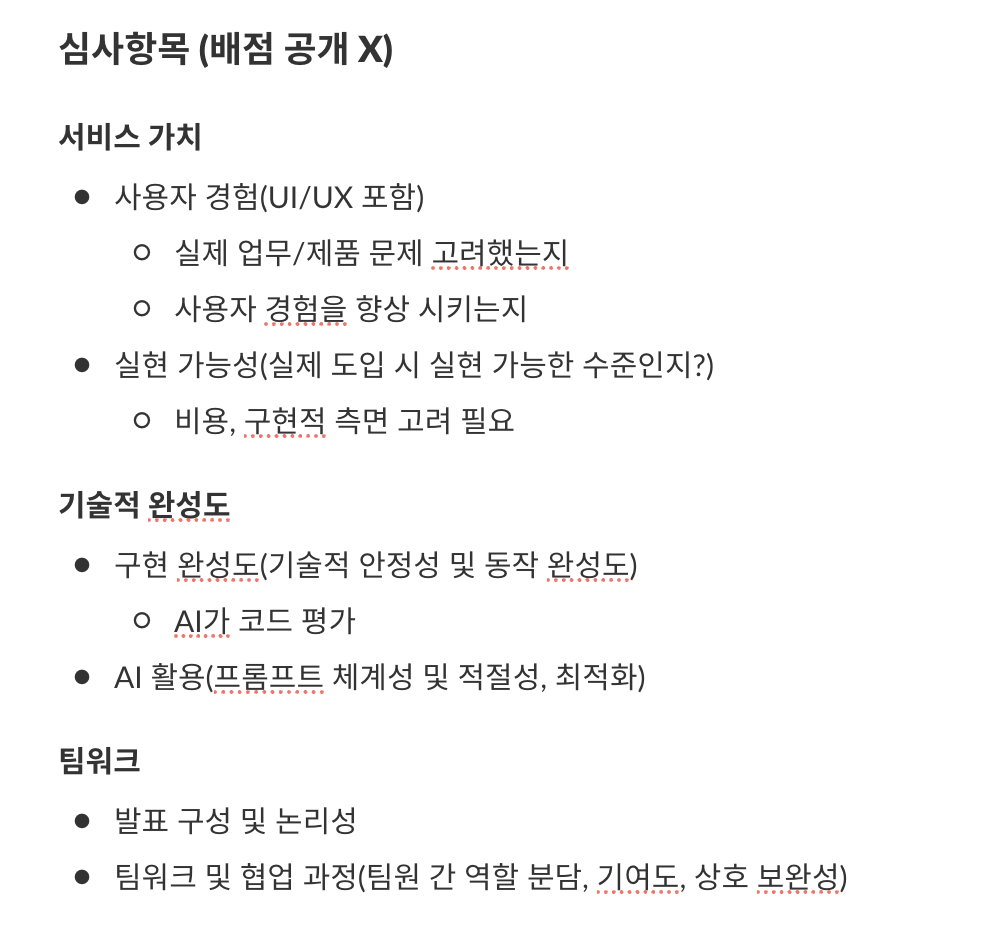 현장 심사위원 분들은 각 분야(PO,개발,영업 등)의 팀장/실장/총괄 분들이 골고루 섞여 계셨고 AI 심사는 사전의 작성된 프롬프트를 당일 받아서 각자 프로젝트의 AI 툴에게 입력하고 vibe.md파일과 함께 AWS codecommit을 하면 다시한번 코드 전체를 평가하는 형식이었다.