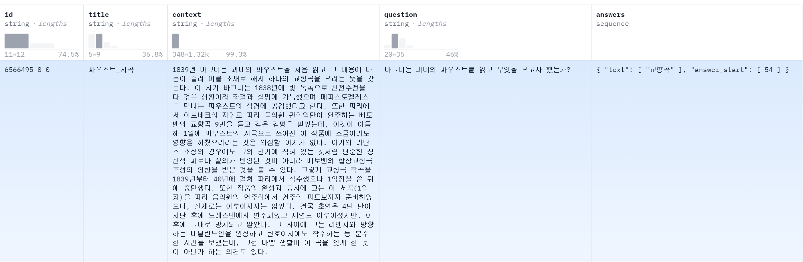 위 사진과 같이, 위키백과의 제목(title), 내용(context), 내용을 바탕으로 생성된 질문(question), 질문에 대한 답변(answers)로 이루어져 있다.
