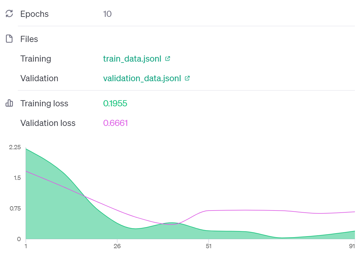 FineTuningJob(id='ftjob-yV...YO', created_at=1..2, error=Error(code=None, message=None, param=None, error=None), fine_tuned_model=None, finished_at=None, hyperparameters=Hyperparameters(n_epochs='auto', batch_size='auto', learning_rate_multiplier='auto'), model='gpt-3.5-turbo-0125', object='fine_tuning.job', organization_id='org-xs...aV', result_files=[], status='validating_files', trained_tokens=None, training_file='file-u...v', validation_file='file-0...h', user_provided_suffix=None)