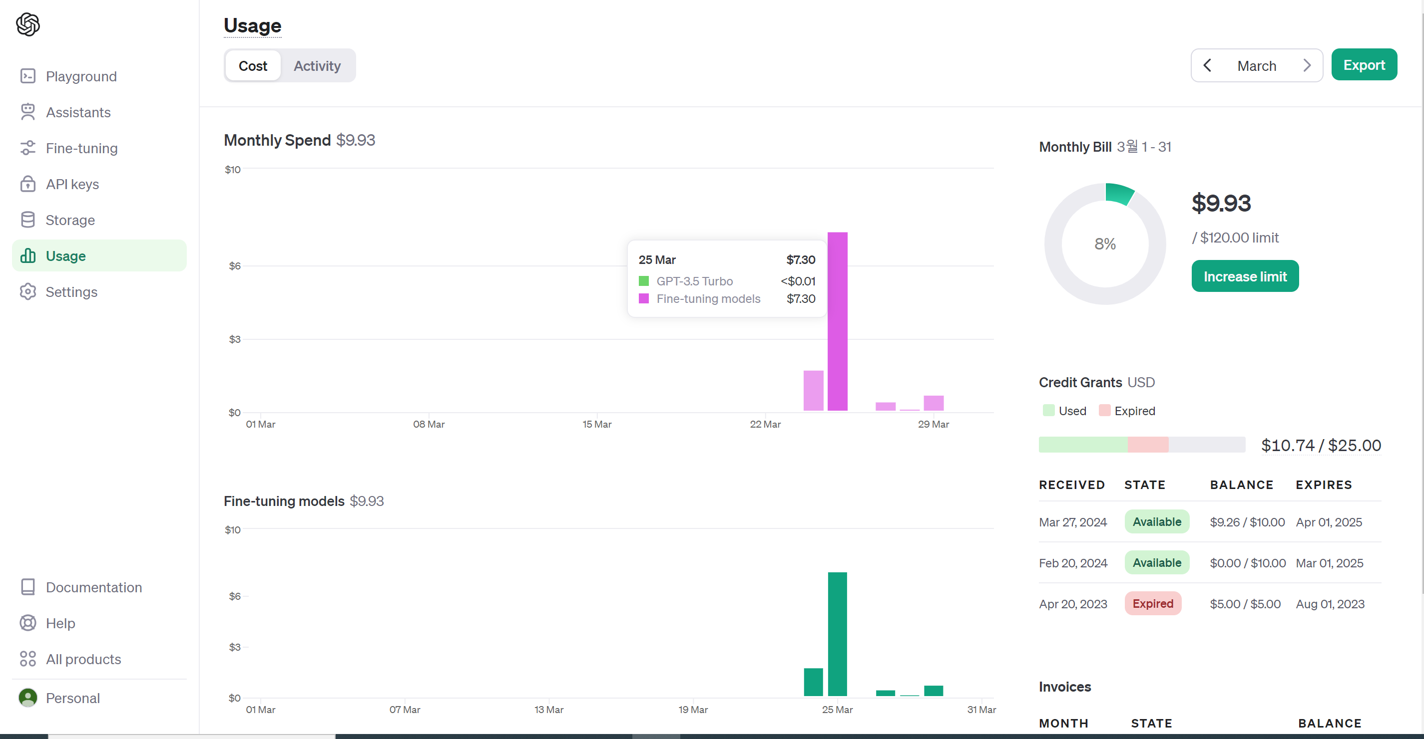 500개 train_data, 100개 validation_data로 학습을 돌렸을 때 약 한시간 십분 정도 소요됐고, 904,755개의 토큰을 사용한 결과 7.3$(9,837원)이 부과 되었다.