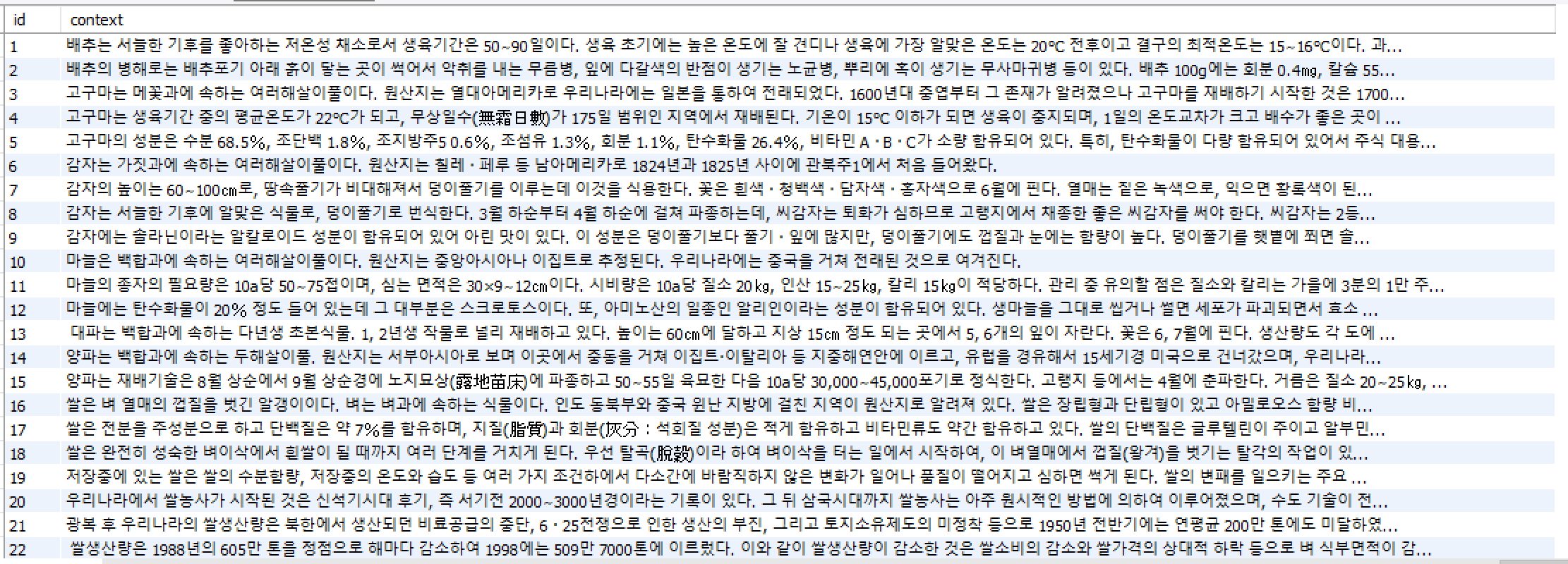 질문을 생성할 문맥이 필요하기 때문에 미리 농산물 관련 데이터를 수집해 MySQL에 저장해뒀다. 데이터는 여기에서 수집했다.