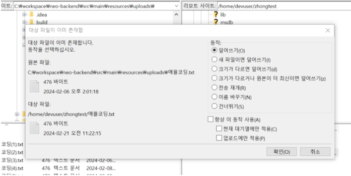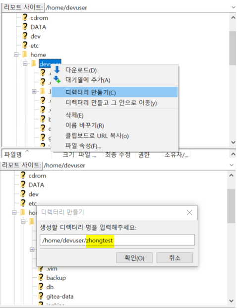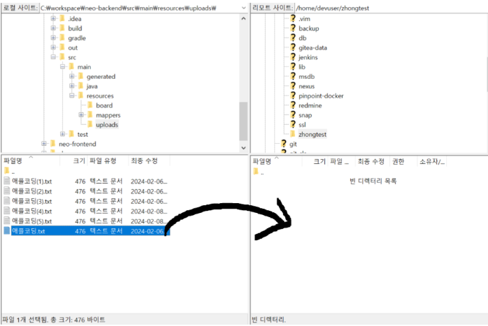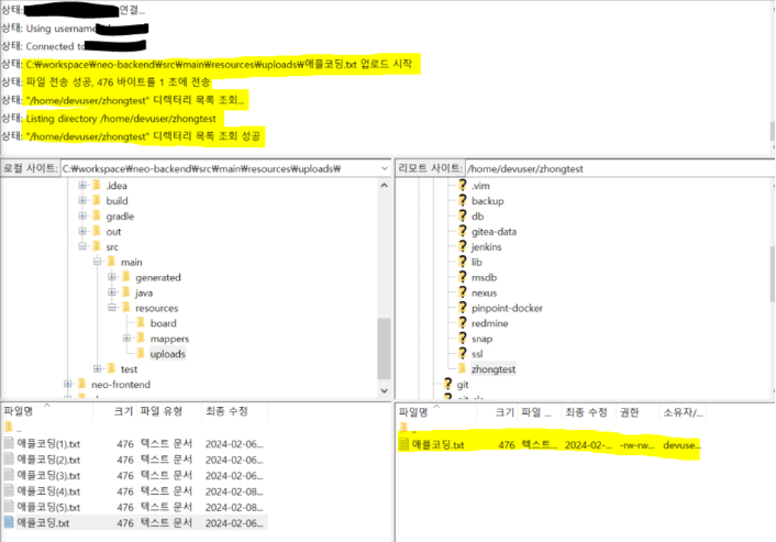 5. 리모트사이트에서 새로운 디렉토리를 생성하고 로컬에 있는 텍스트.txt파일을 생성한 디렉토리에 전송해 보자. 드래그 앤 드랍과 더블클릭을 통해 전송이 가능하다. 여러개를 전송 할경우엔 전송할 파일을 여러개 선택후 전송이 가능하다.
