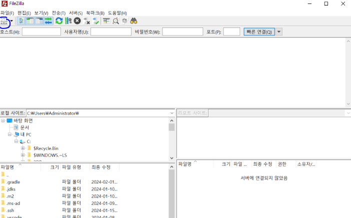 1. 처음 실행시에 원격으로 연결된 사이트가 없으면 비어 있는데, 좌측 상단 파일(F)밑에 아이콘을 클릭해 보자.