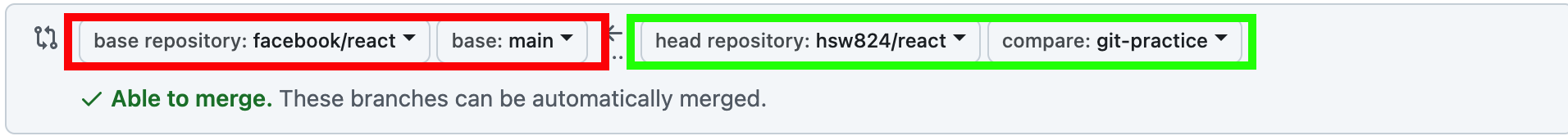 - 이제 pull request를 작성해서 원본 레파지토리 개발자한테 내가 작업한 내용을 코드에 반영해달라고 요청할 수 있다.(코드리뷰 요청)