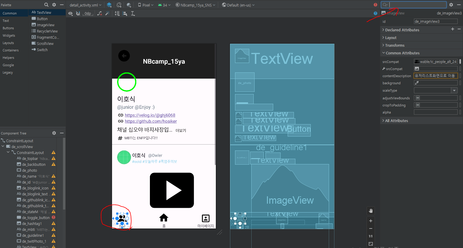 그 다음 해당하는 xml파일로 이동해서 버튼기능을 할 widget을 선택한다.