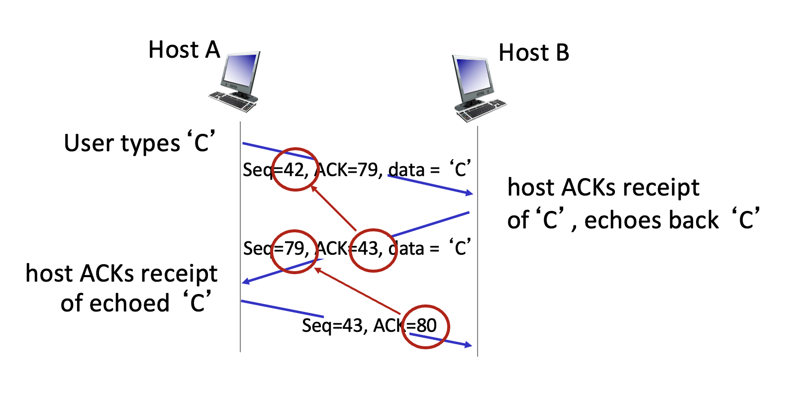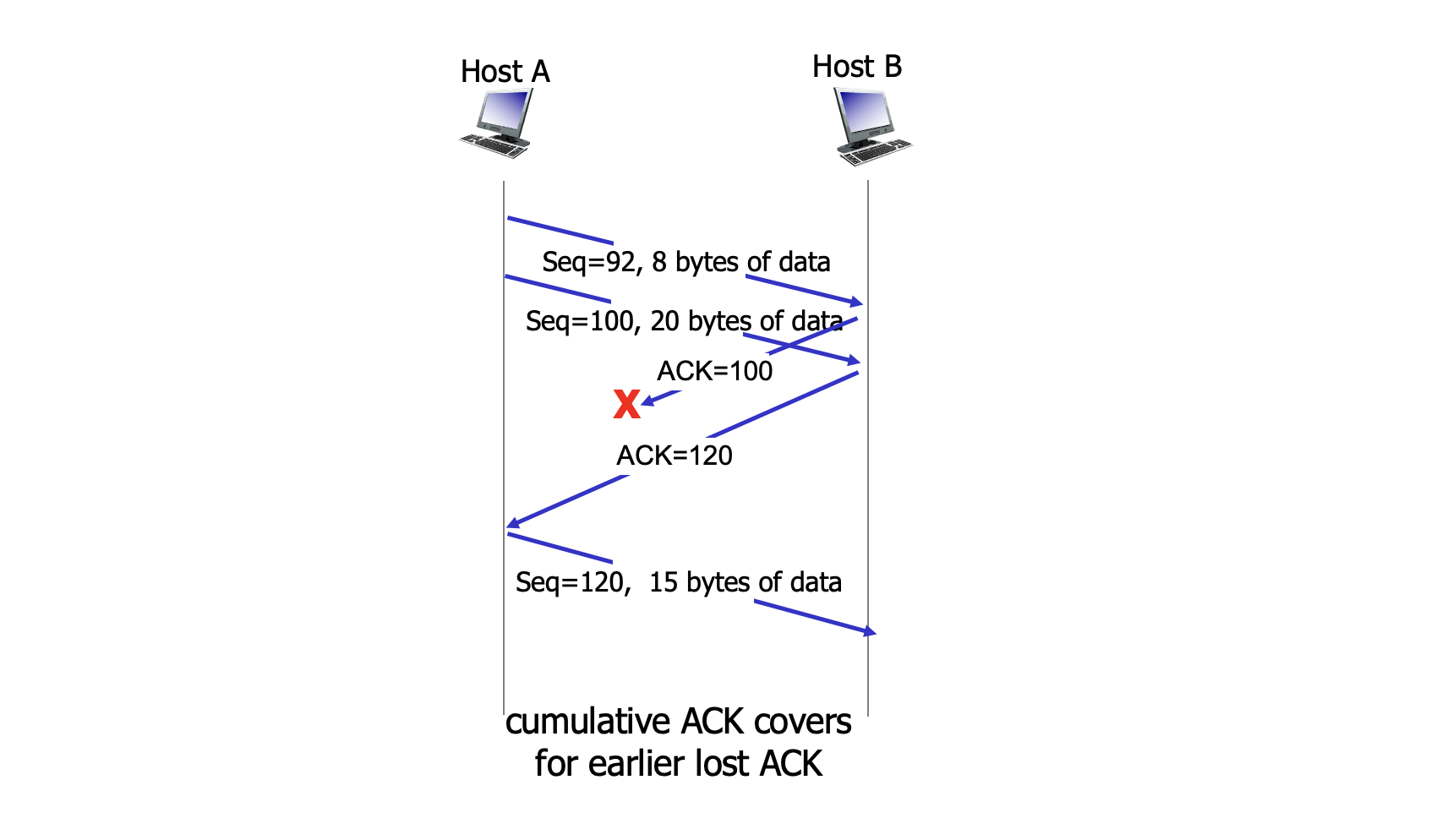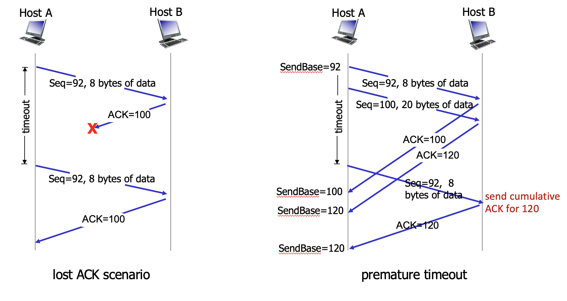 그럼 수신자는 cumulative ACK를 보낼 것이고 타임아웃 이전에 두번째 세그먼트에 대한 ACK가 도착한다면 송신자는 두번째 세그먼트를 재전송하지 않을 것이다.