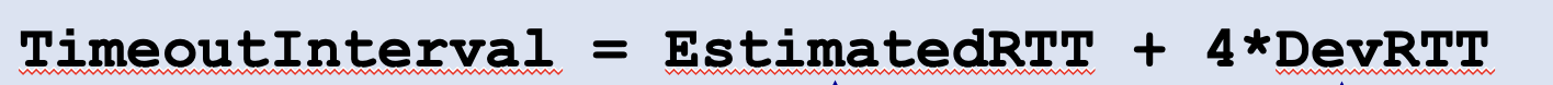 약간의 여윳값을 더한 값으로 설정하는데 SampleRTT값에 많은 변동이 있으면 여윳값이 커야하고 변동이 작을 때는 작아야한다. 따라서 이 때 DevRTT가 사용된다.