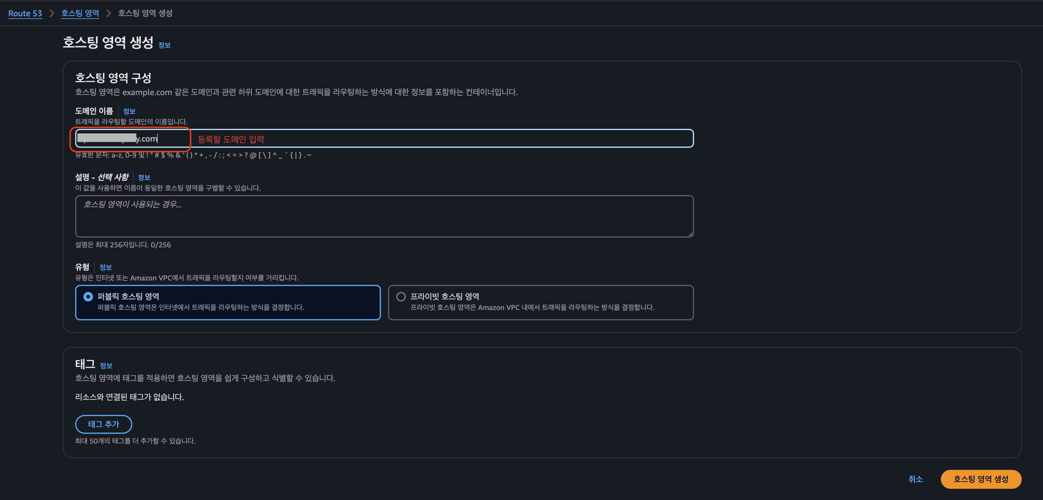 등록할 도메인 이름을 입력하고 호스팅 영역을 생성합니다.
