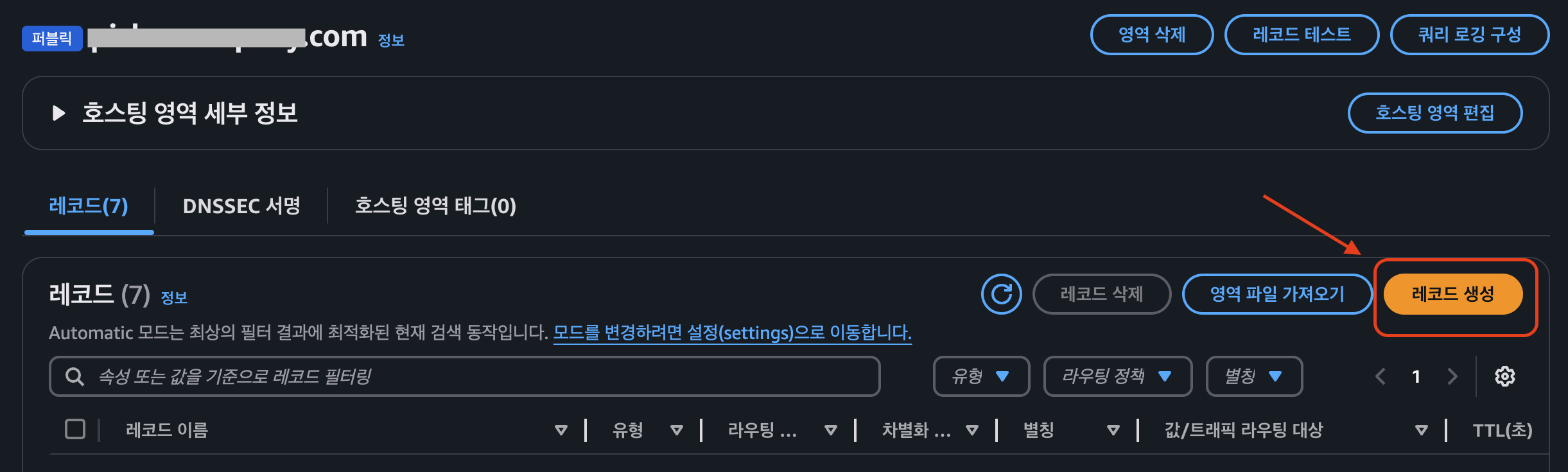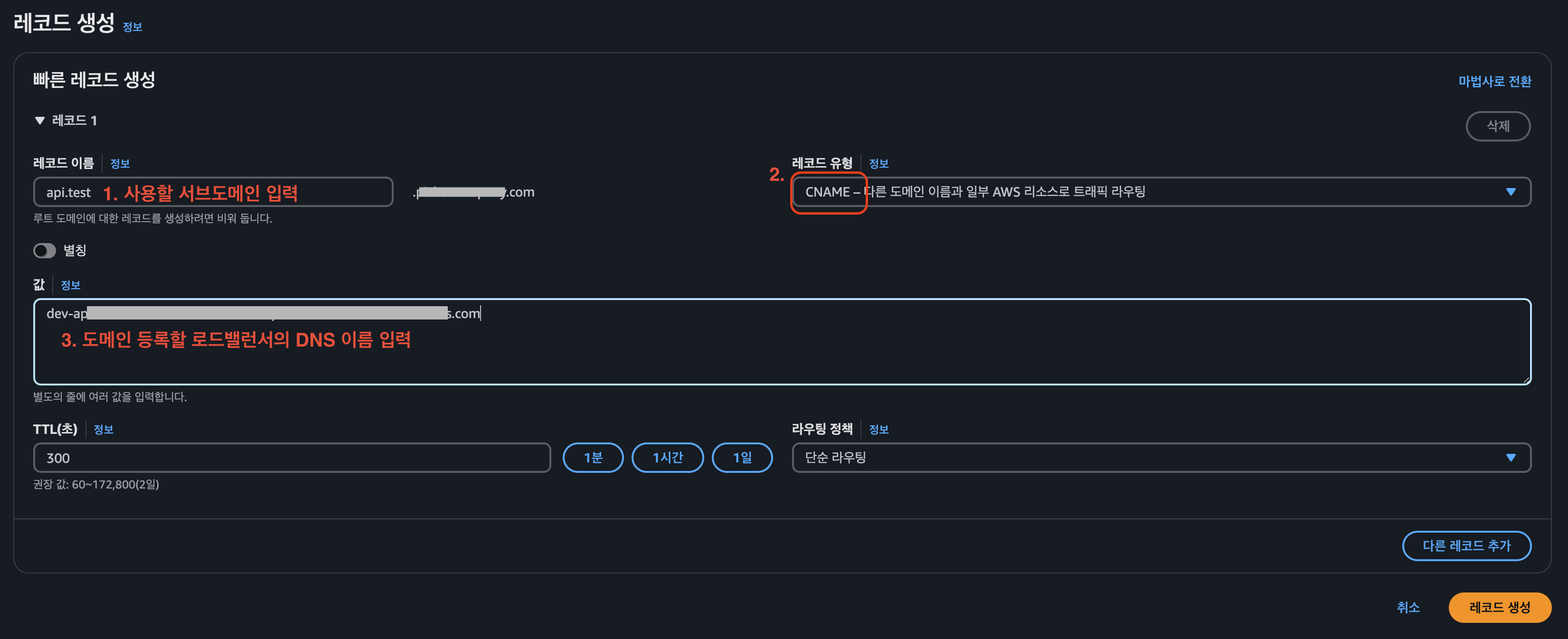이를 위해서는 Route 53에서 레코드를 생성하여 각 서브도메인을 등록해 주어야 합니다.