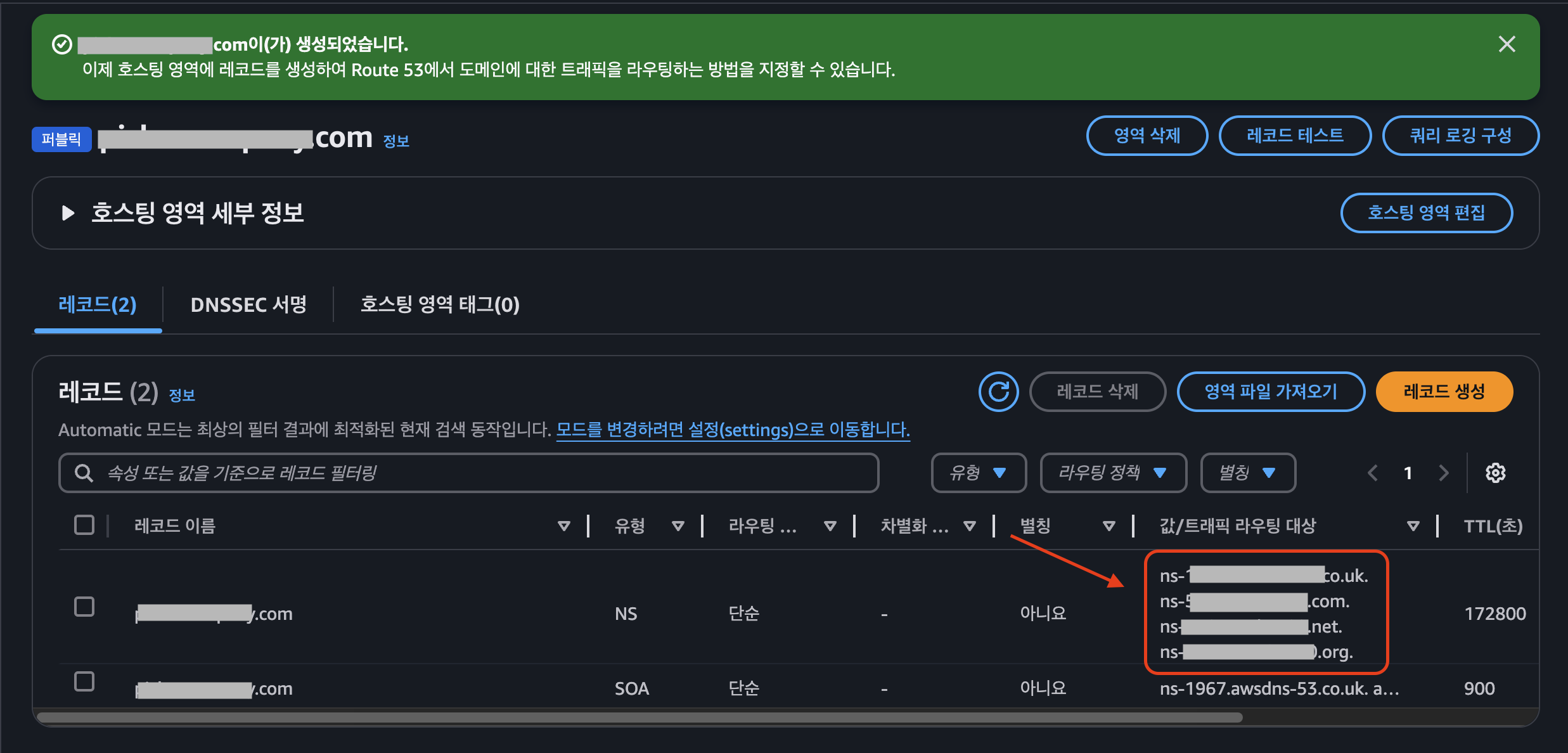 호스팅 영역이 생성되면, 생성된 NS(Name Server) 유형의 값들을 복사합니다. 이는 도메인을 구매한 곳에 네임서버 정보를 등록하기 위해 사용됩니다.