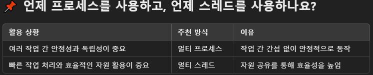 - 예를 들어, 웹 서버는 동시 처리가 중요하기 때문에 멀티 스레드를 사용합니다.
