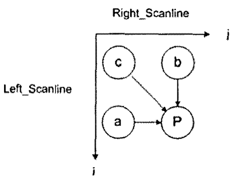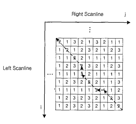 는 각각 수평, 수직, 대각선 방향의 누적연산을 나타내며, 대각선 방향의 경로는 DSI이 누적되지만, 수평 혹은 수직방향의 경로의 경우 DSI 상의 값 대신 penalty 값을 누적한다. 이와 같이 계산된 cost matrix의 값 중 최소값을 최적화된 disaprity의 값으로 선택한다.