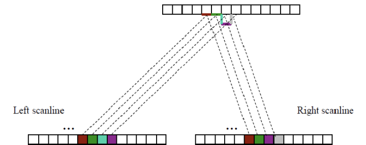 위의 생성된 DSI를 보면 Left scanline과 Right scanline으로 이루어져 있으며, DSI의 대각선보다 약간 오른쪽에 검정색 선이 존재하는 것을 볼 수 있다. 이 선이 disparity에 대한 정보를 닮고 있으므로 아래와 같이 선 주위만 사용하여 disaprity를 계산한다.