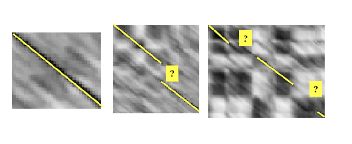 cost matrix를 계산할 때 사용하는 penalty의 값은 Back tracking 과정에서 경로선택에 큰 영향을 미친다. penalty 값이 작다면 수평 또는 수직방향의 경로가 선택될 가능성이 높고 크다면 대각성 방향의 경로가 선택될 가능성이 높아진다. 일반적인 영상은 동일한 disparity를 가지는 부분이 많기 때문에 보통 큰 penalty를 사용하고 이는 물체의 수평/수직 방향으로 진행되어야하는 경계부분에서 대각선 방향으로 경로가 결정되는 문제가 발생하며 이를 Streaking이라고 부른다.