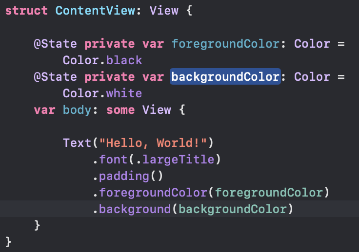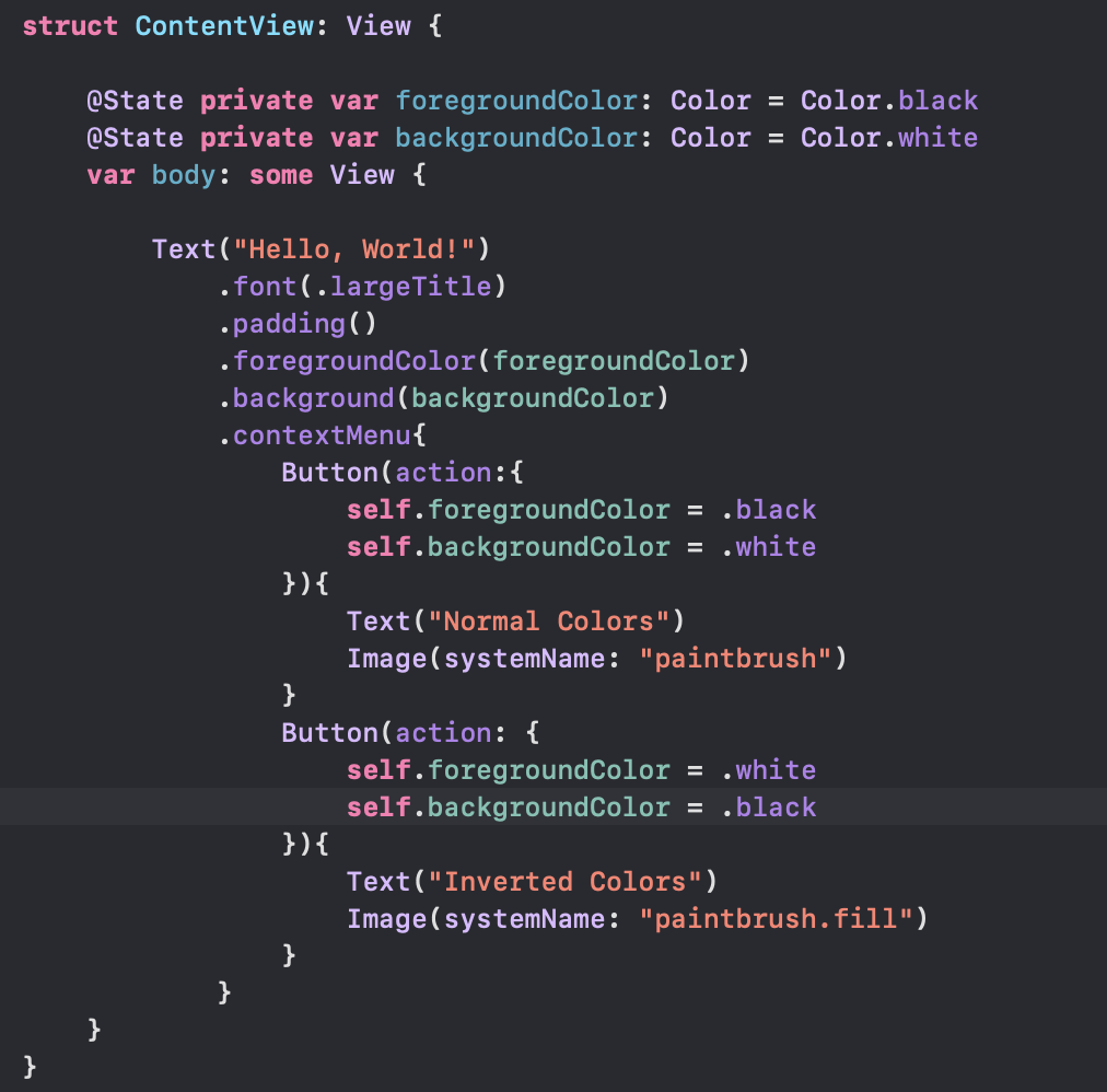 콘텍스트 메뉴는 contextMenu() 수정자를 사용해 메뉴 항목으로 제공되는 뷰를 선언하여 SwiftUI의 뷰에 추가된다. ContentView.swift 파일의 body 뷰를 다음과 같이 수정하여 콘텍스트 메뉴에 메뉴 항목을 추가하자.